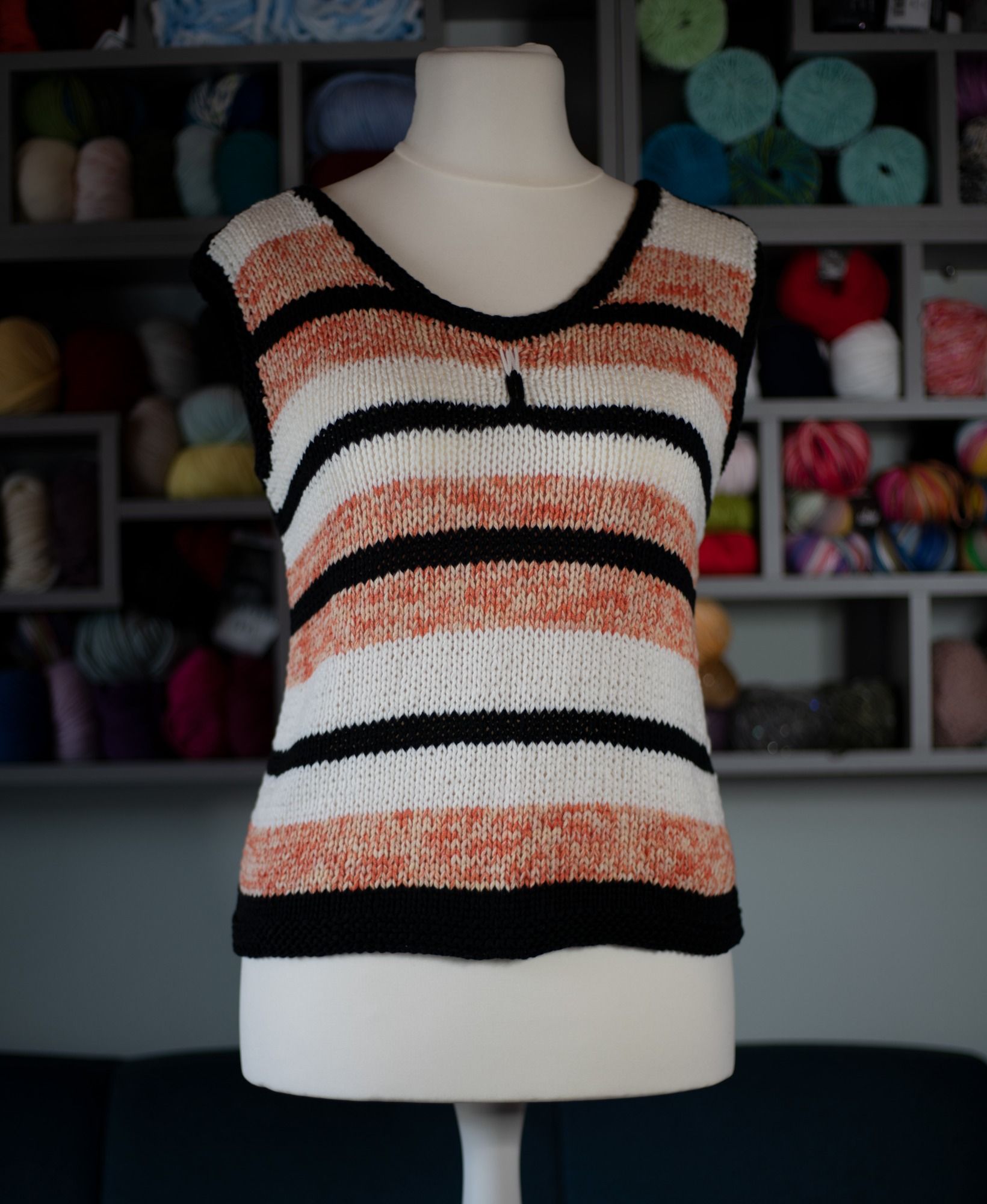 Schicker Pullunder, der auch hervorragend als Top getragen werden kann. Farbverlaufendes Bändchengarn mit Ajourmusterblende am Saum.