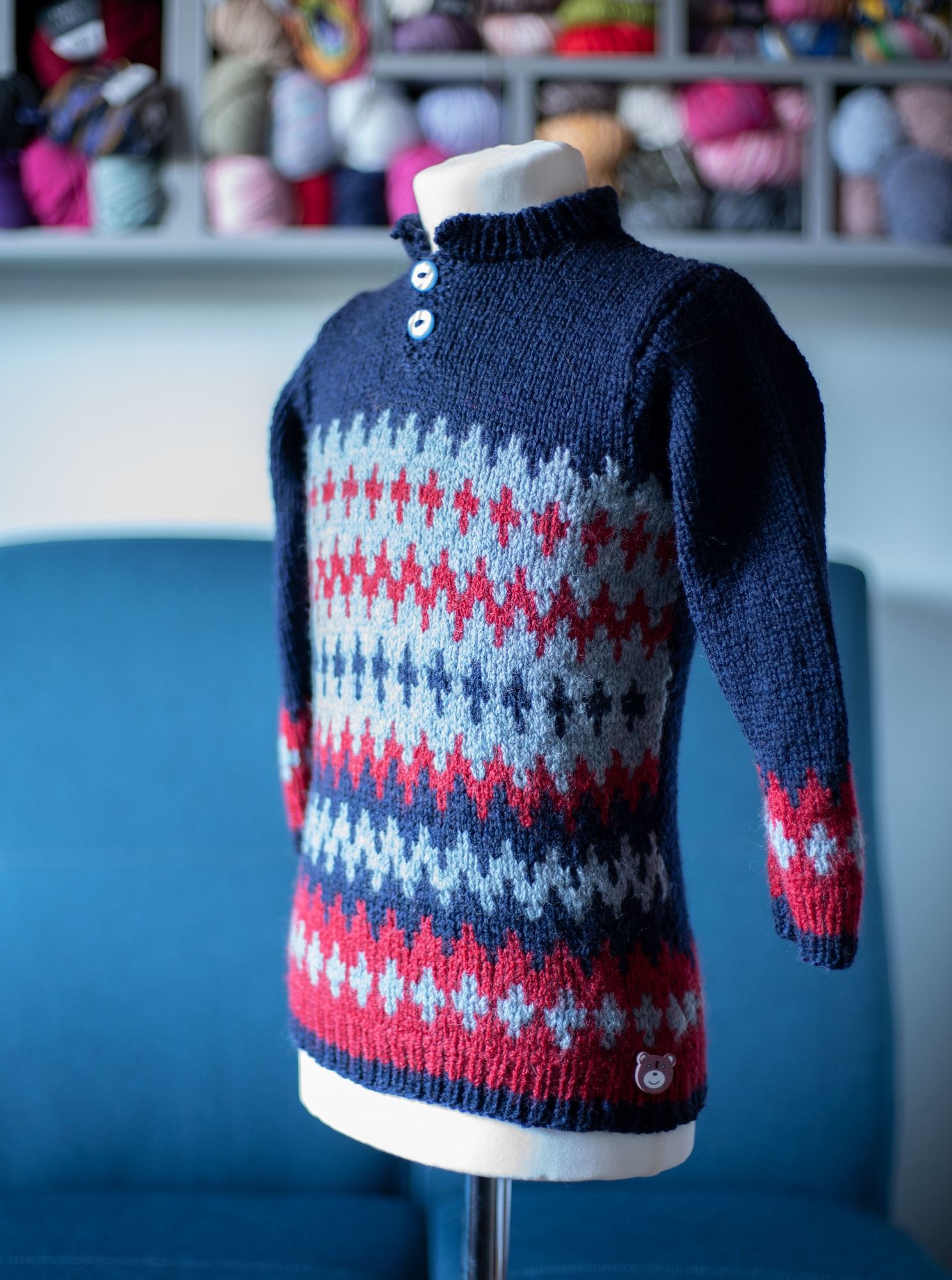 Kuschlig, warmer Merinopulli im Jacquardmuster mit Poloausschnitt. Ausschnitt und Farben sind variierbar. Preis ab 70 Euro